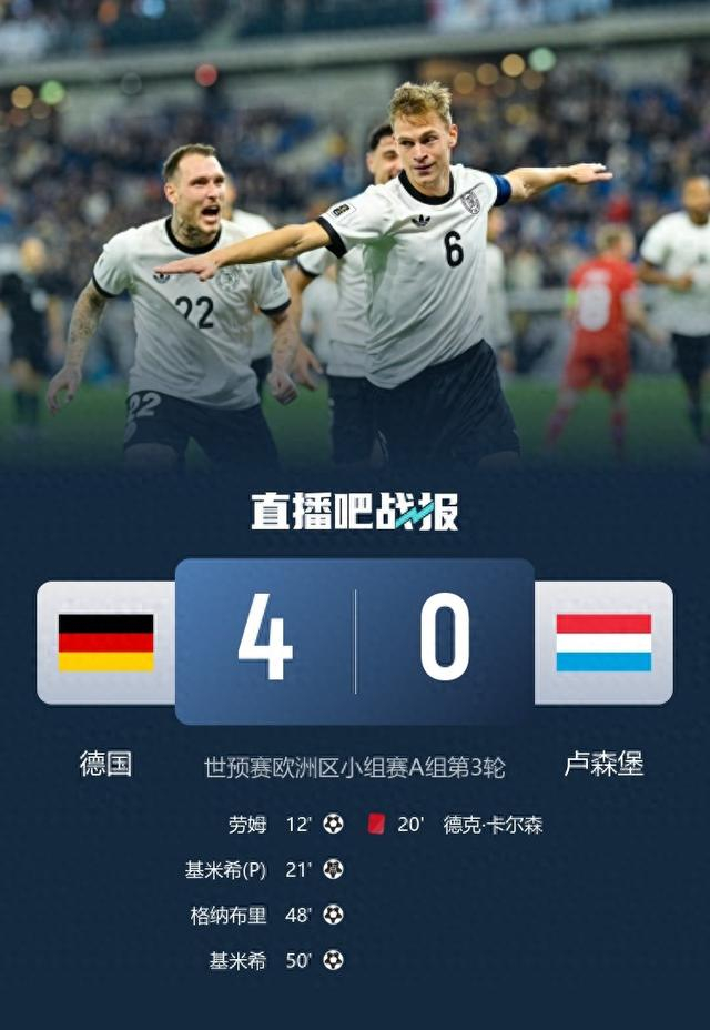 德国在世预赛A组第三轮比赛中,主场4-0完虐十人卢森堡,基米希彰显点球王本色,劳姆任意球轰出精彩一击。胜利让德国暂居榜首,卢森堡显得毫无还手之力。